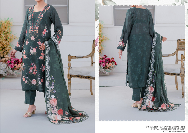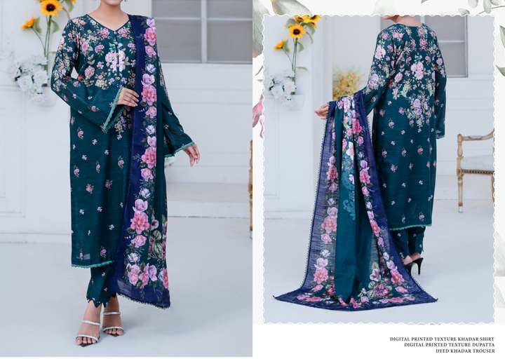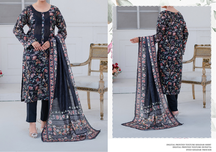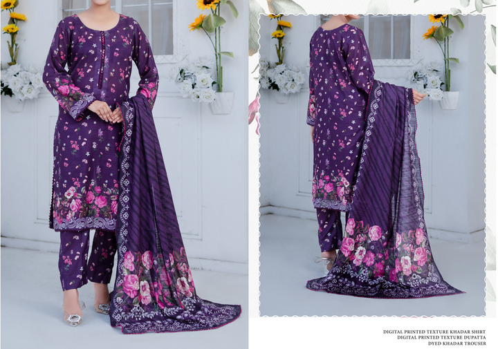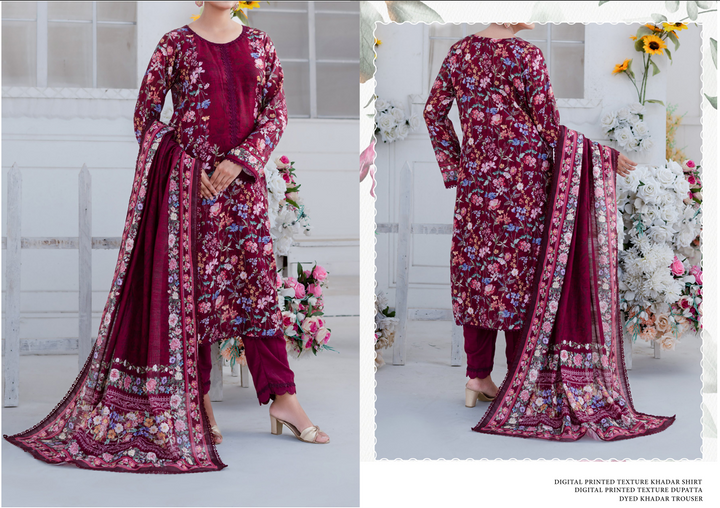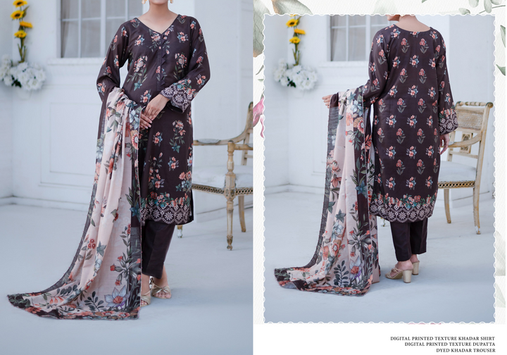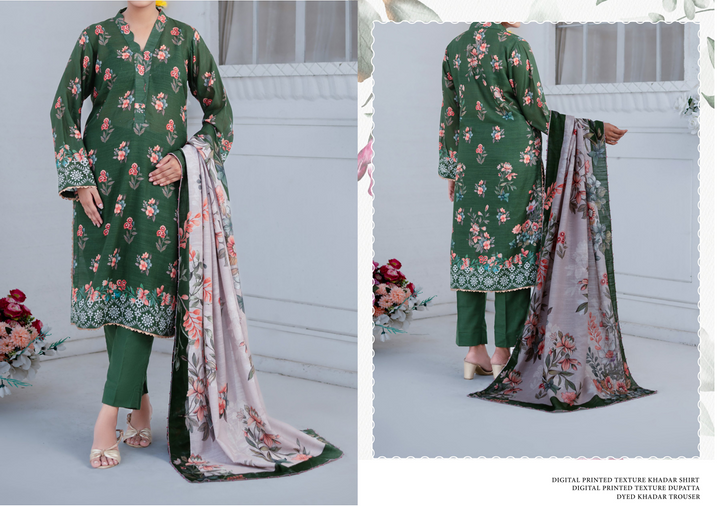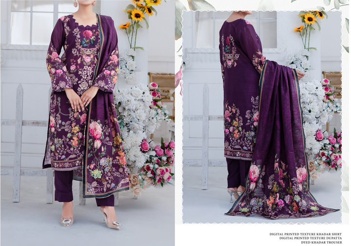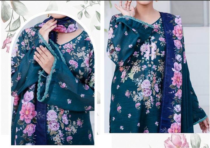 Coordinated 3-Piece Set: Includes the digitally printed Khaddar shirt, the matching printed Khaddar dupatta, and comfortable dyed Khaddar trousers, providing a complete, ready-to-stitch outfit.