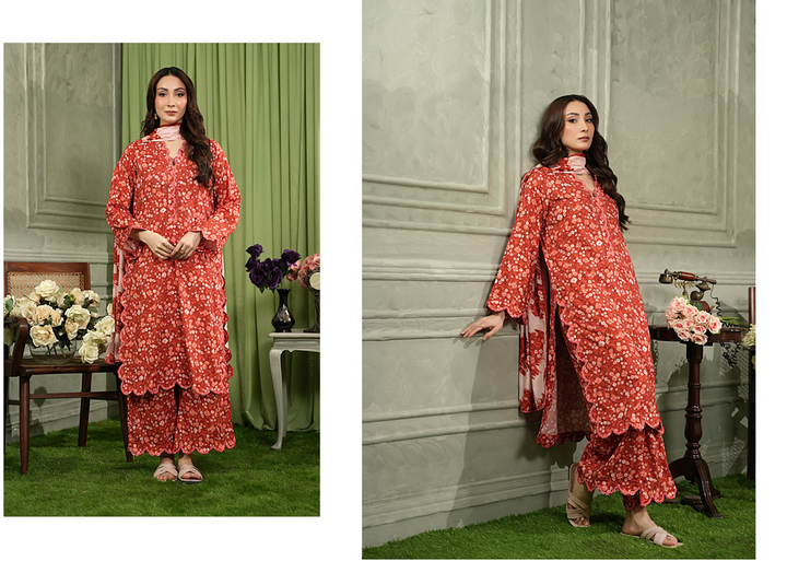 Celebrate heritage and color with our stunning Digital Print Suit Duo, perfectly designed for the contemporary woman who appreciates classic style and comfort. Featuring two distinct yet harmonizing outfits—one in a bold red floral pattern and the other in a serene off-white with rust accents—this collection is crafted from a comfortable, high-quality fabric (likely warm Khaddar or luxurious Lawn). The ensembles are beautifully finished with detailed print work and striking contrast dupattas, making them ideal for daytime functions, family visits, and social gatherings.
