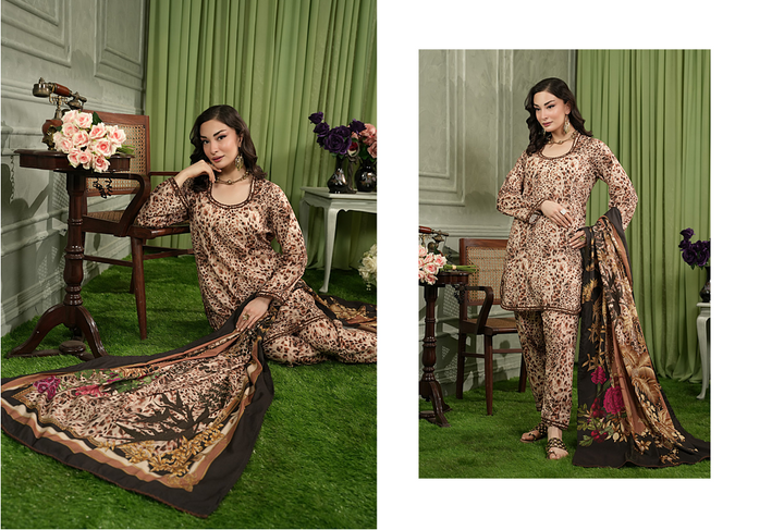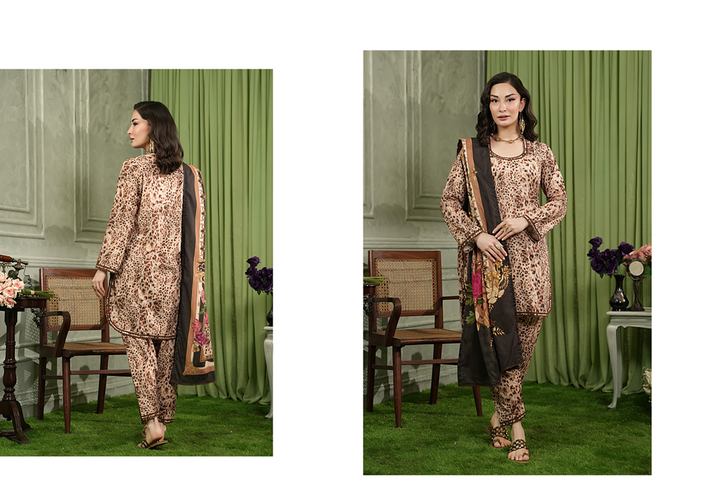 Make a fiercely elegant statement with our captivating Leopard Print Suit. This luxurious ensemble features a striking, all-over leopard print (often called cheetah print) on a smooth, comfortable fabric (likely Silk, Satin, or a premium Winter blend) that offers a beautiful sheen and drape. The bold pattern is perfectly balanced by a sophisticated black and gold contrast dupatta with floral motifs, making this suit an absolute standout for formal evening events, glamorous parties, or festive winter occasions.