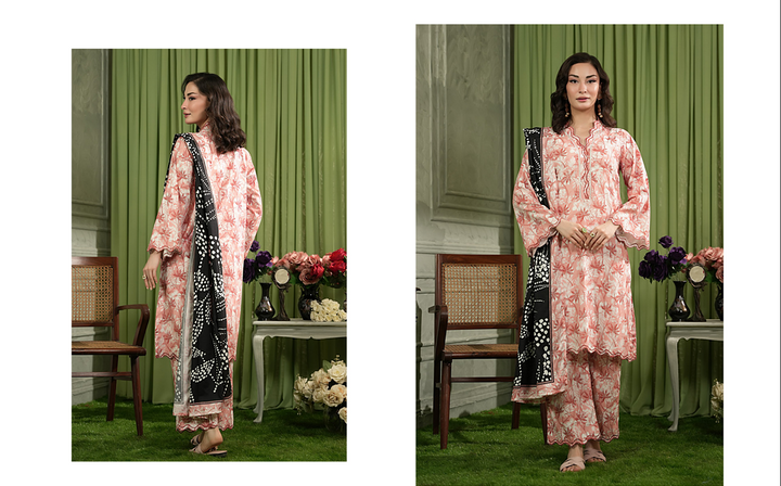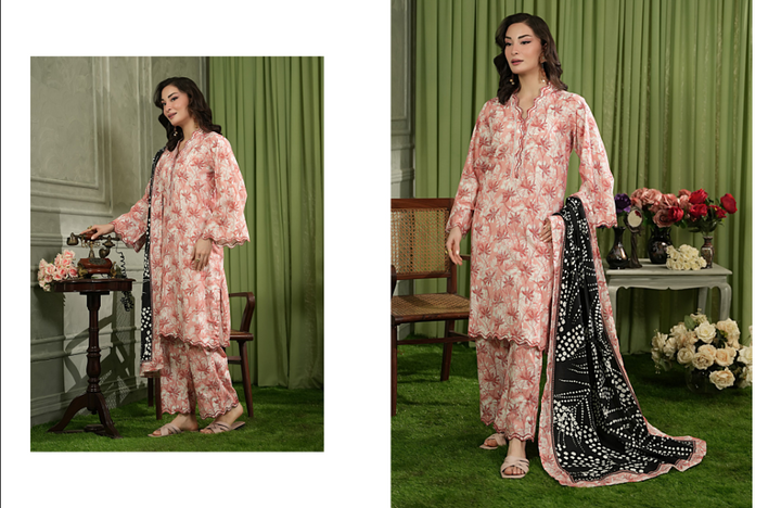 Embrace gentle femininity and modern contrast with our beautiful Pink and White Printed Suit. The fabric features a soft, lovely pink base overlaid with a delicate, artistic print of white leaves or florals, creating a breezy, romantic texture. This charming look is strikingly anchored by a contrasting black and white printed dupatta, adding a bold, graphic edge. This ensemble is perfect for sophisticated daywear, spring/summer luncheons, or any occasion where you seek comfort, grace, and a fashion-forward color combination.